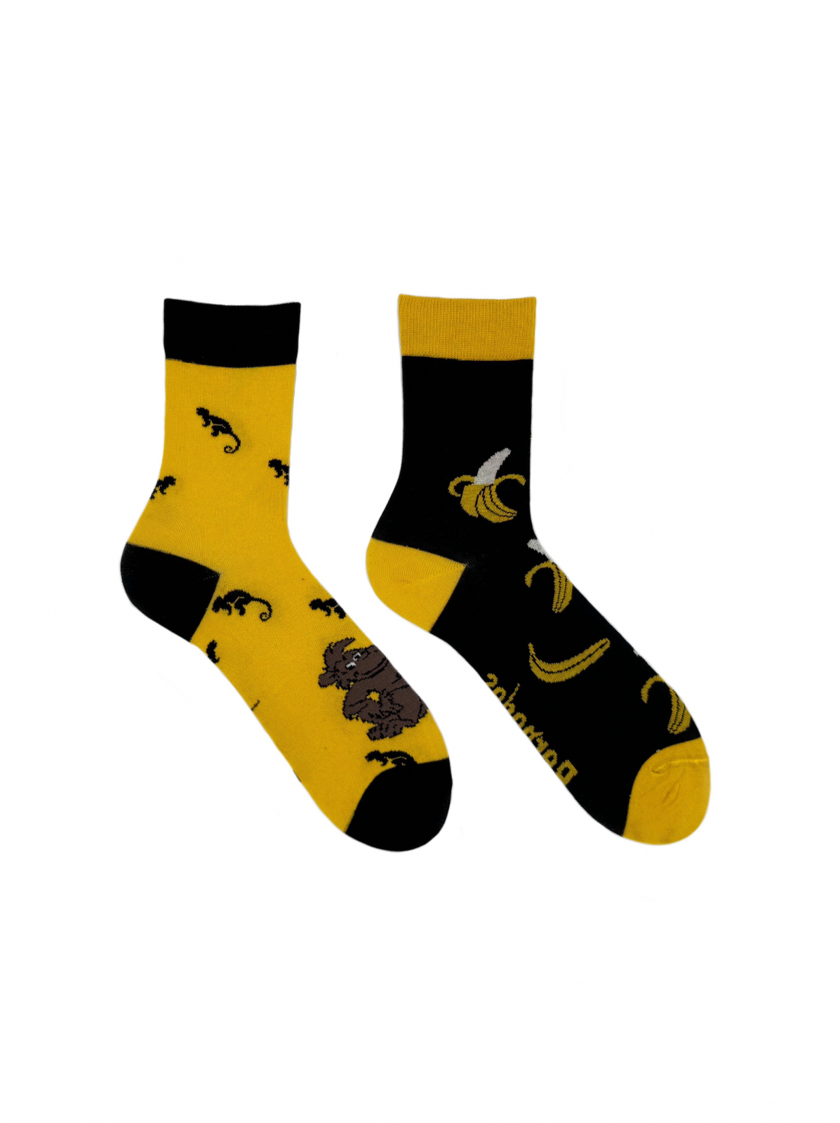 Intră în jungla amuzantă cu șosetele "Maimuțele Buclucașe"! O șosetă neagră și una galbenă, fiecare împodobită cu maimuțe jucăușe și banane în diferite ipostaze haioase. Aceste șosete îți aduc o doză de energie și zâmbete la fiecare purtare, perfecte pentru cei care adoră să-și exprime latura veselă și plină de viață. Alege combinația perfectă de distracție și confort!
