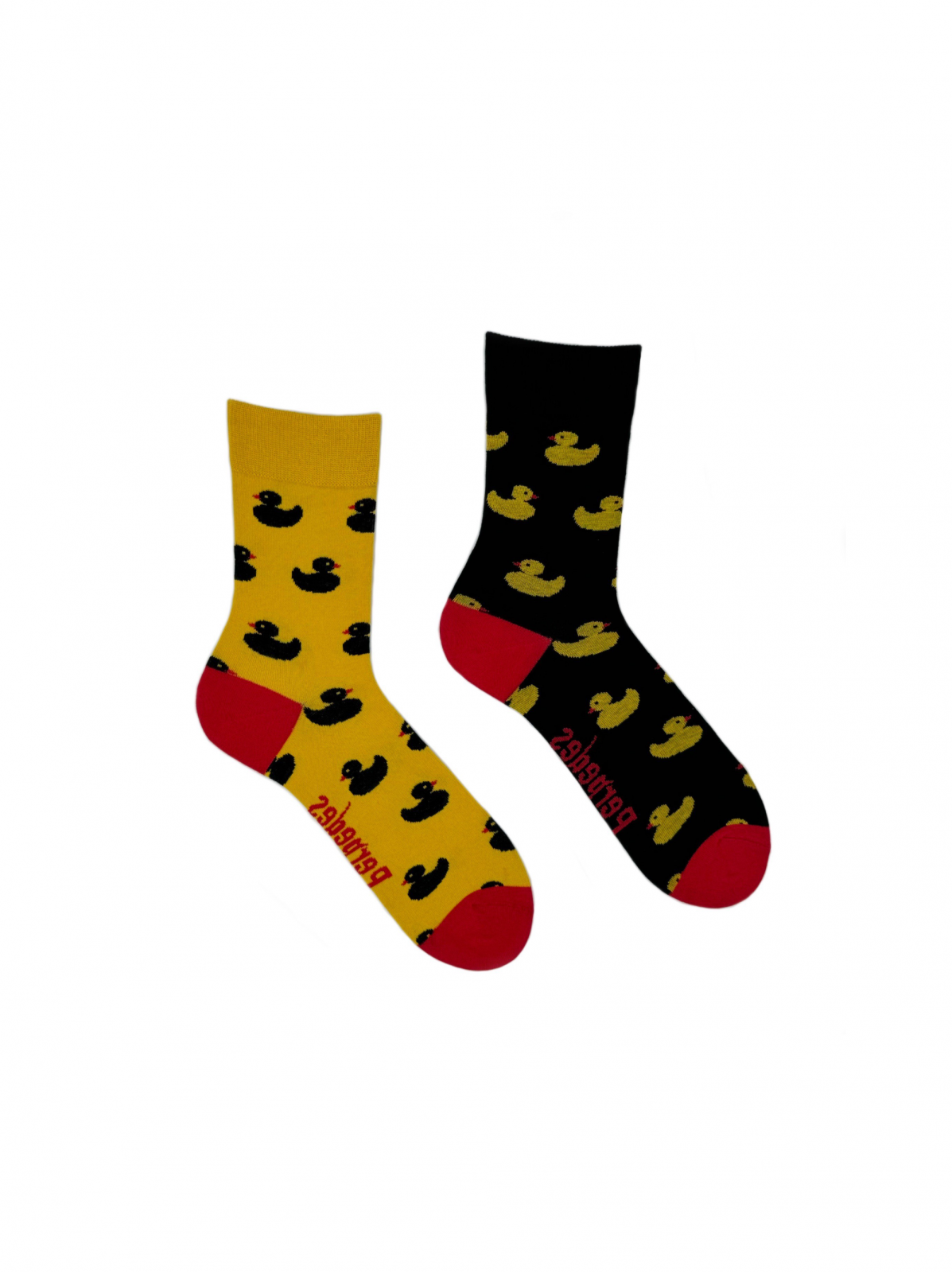 Descoperă farmecul amuzant al șosetelor desperecheate cu rățuște! Setul nostru jucăuș conține o șosetă galbenă și una neagră, fiecare decorată cu rățuște adorabile care aduc un strop de veselie ținutei tale. Fiecare pereche este o combinație unică de stil și confort, creată special pentru cei care își doresc să iasă din tipare. Materialele de calitate asigură o purtare plăcută, în timp ce designul desperecheat te încurajează să-ți exprimi individualitatea. Perfecte pentru orice ocazie, aceste șosete îți vor transforma fiecare zi într-o poveste plină de culoare și voie bună!